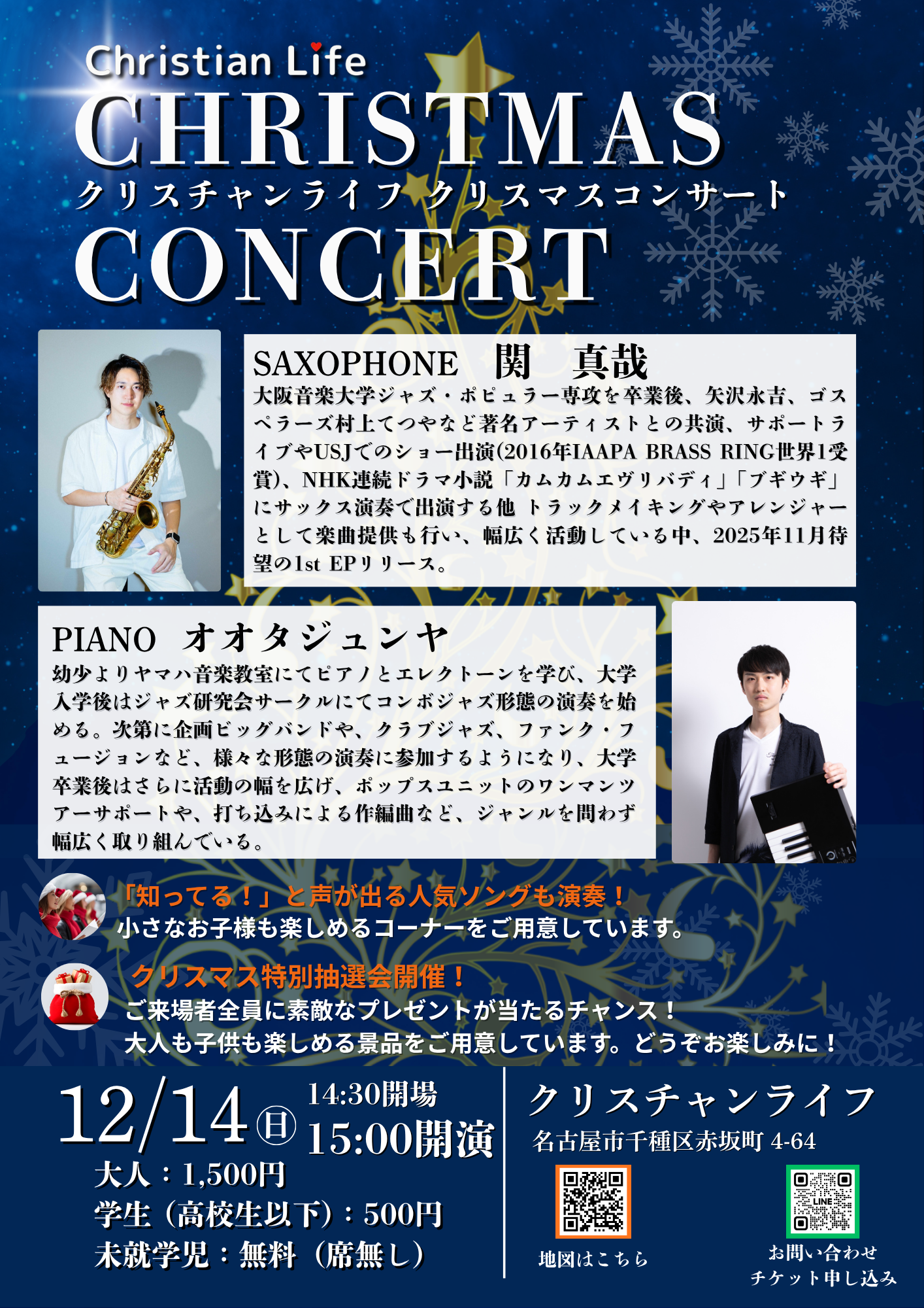 今年はメジャーシーンでも活躍しているクリスチャンサックスプレーヤーの関 真哉さんとピアニストのオオタジュンヤさんを迎えてクリスマスコンサートを行います。